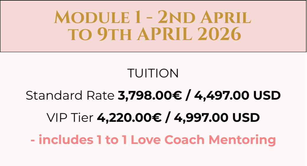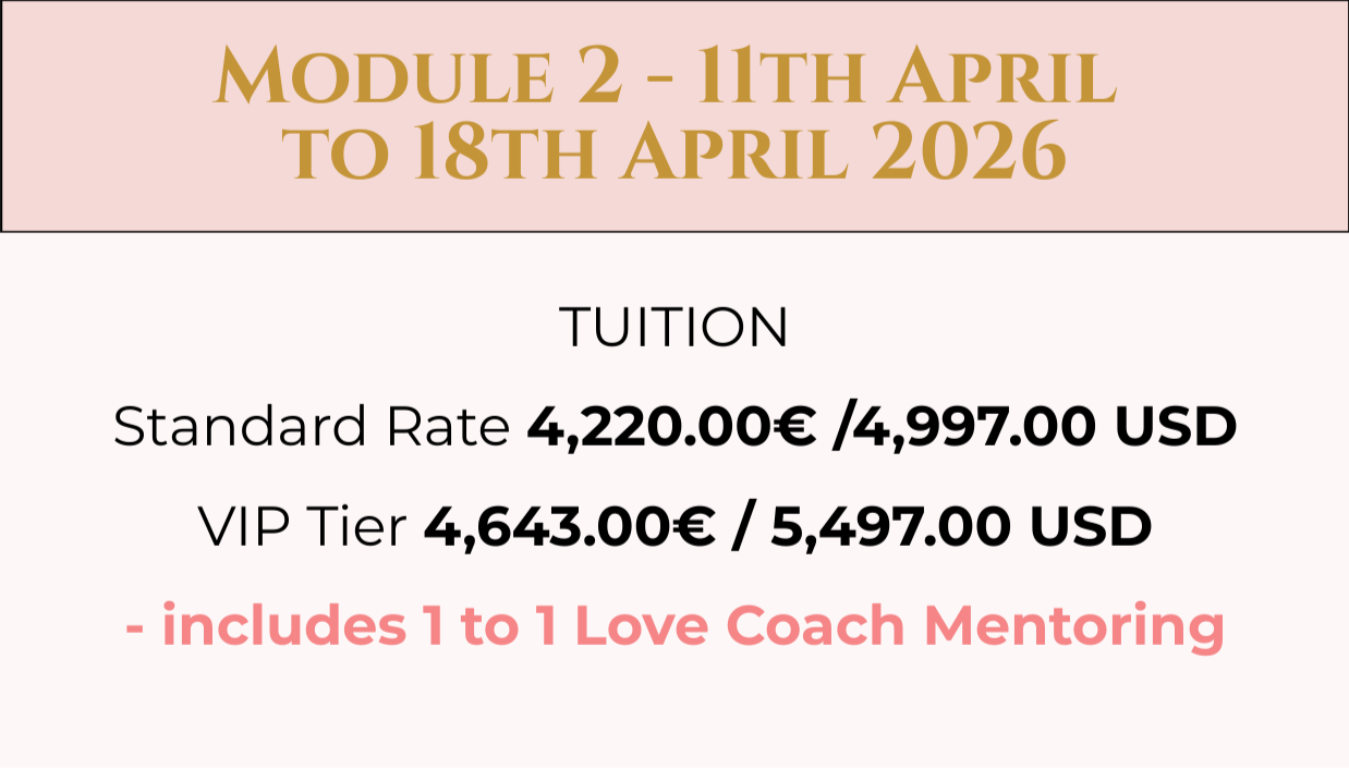 It's time to birth a new global generation of Love Coaches from every culture and continent. This GLCA Love Coach Certification Retreat will answer that all. The training will align with the standards of the International Coaching Federation (ICF), with one-third focused on its Core Competencies and Code of Ethics. As the GLCA continues to work towards becoming an ICF-accredited coaching training institute, we educate our Love Coaches to become masters in heart-centred wisdom while incorporating globally-recognised coaching practices.