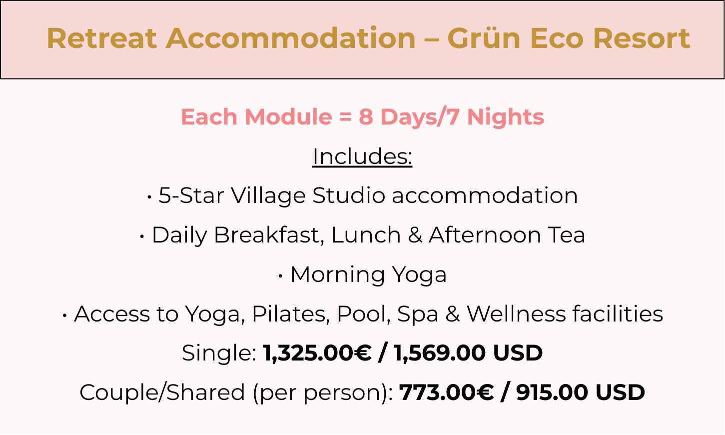 Stay close to the action with your colleagues and facilitators Adriane and Miguel for 8 days / 7 nights at the 5-Star Retreat Village Studio with Breakfast, Lunch & Afternoon Tea with Access to all Yoga, Pilates, Pool, Spa & Wellness Facilities at Grün Eco Resort.