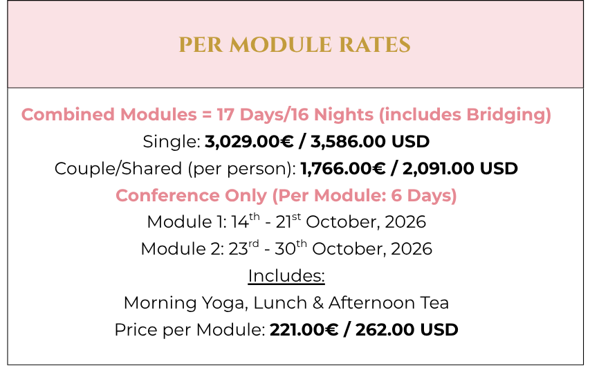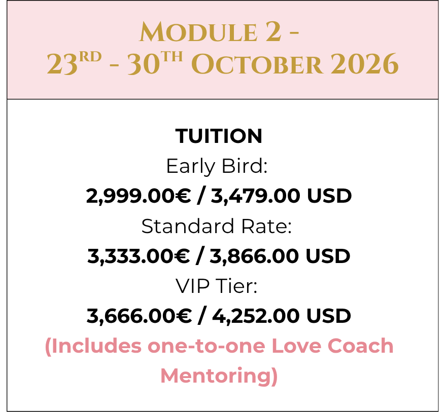 Combining modern psychology, coaching methods and spiritual transformation, Adriane's soul-centred approach means she has carefully designed each retreat module to move you through your own deeper levels of healing and awakening while building your professional mastery in the Art of conscious Love. With a varied programme full of guided workshops, live processes, embodiment practices and sacred connection rituals, each day builds upon the previous, resulting in a glorious crescendo of your growth and empowerment to step into your new vocation as a Love Coach.